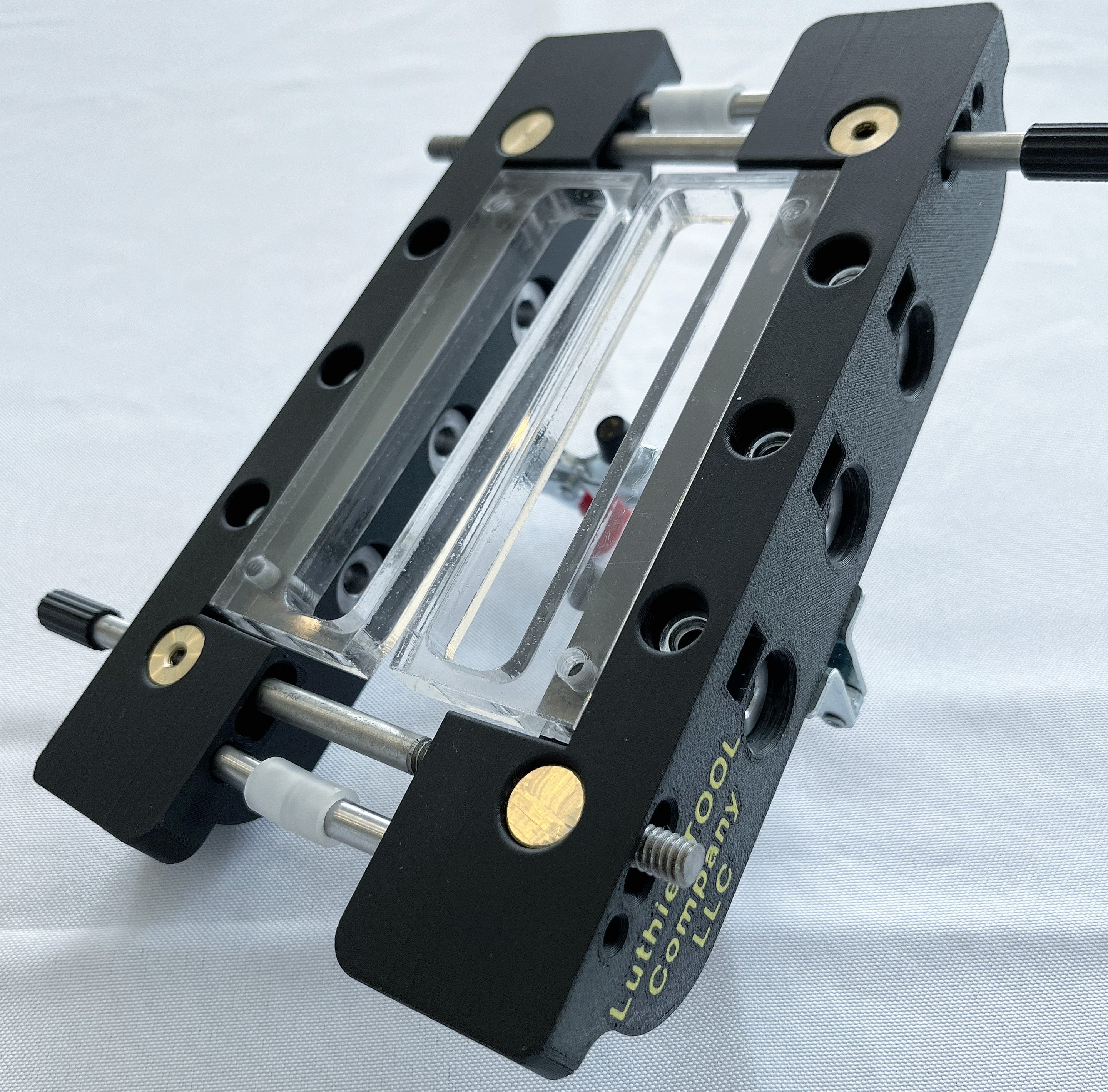 Only one set up and the tuner holes and slots can be cut. The fixture can be adjusted so that the one side is always symmetrical to the other side, keeping everything centered. This new improved version now allows for center clamping with complete height adjustment for various peg head thickness. The soft pads on the spindles will prevent any damage to the back of the peg head. This tool has become the industry standard for slot head cutting jigs. This tool is designed to be used with template guides, we DO NOT recommend using router bits with bearings, see manual.
