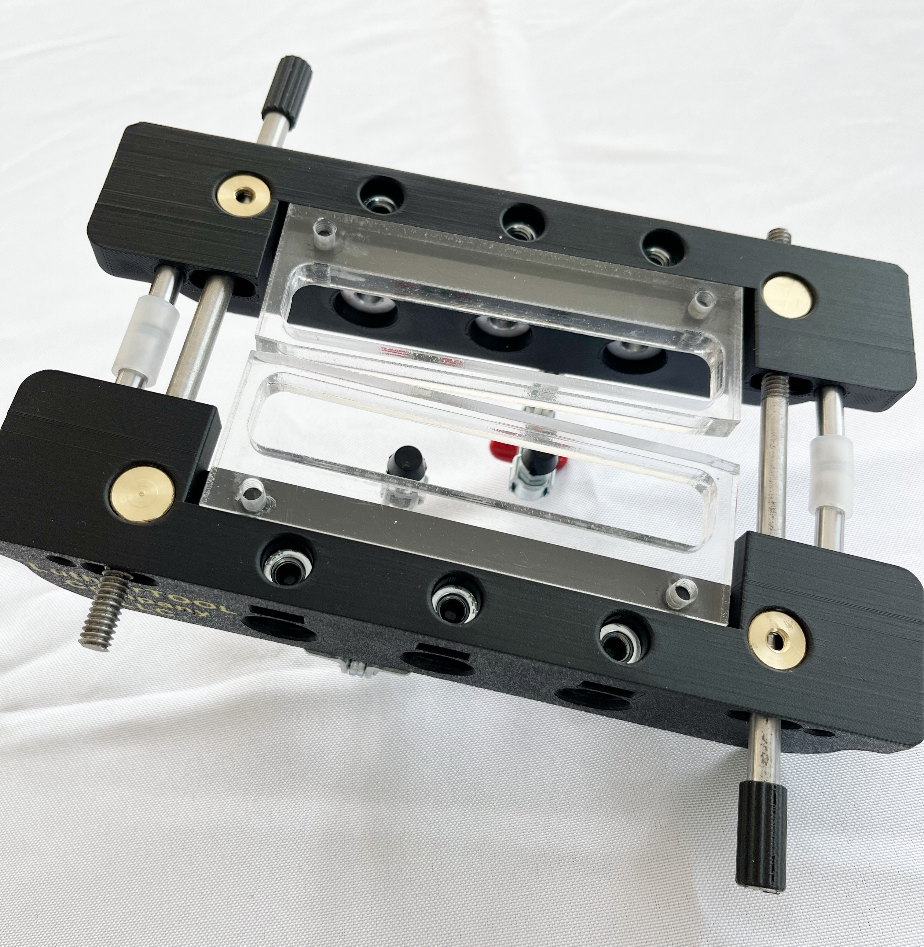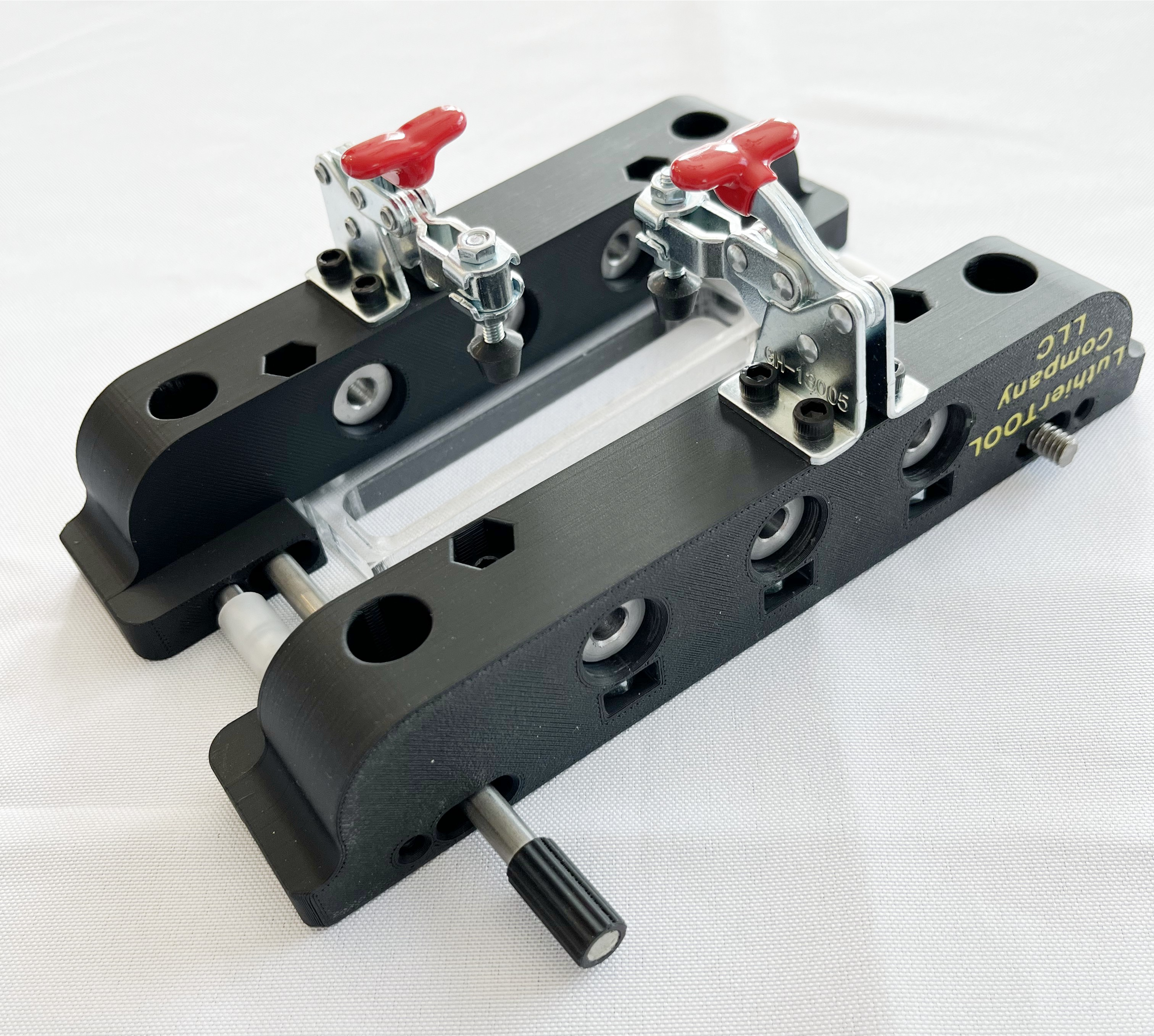 Only one set up and the tuner holes and slots can be cut. The fixture can be adjusted so that the one side is always symmetrical to the other side, keeping everything centered. This new improved version now allows for center clamping with complete height adjustment for various peg head thickness. The soft pads on the spindles will prevent any damage to the back of the peg head. This tool has become the industry standard for slot head cutting jigs. This tool is designed to be used with template guides, we DO NOT recommend using router bits with bearings, see manual.